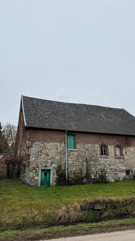 There were little hobbit like house structures, ancient lichen covered walls, intricate iron gates, medieval plaques, barns with teal painted doors (for sale, if you’re interested), wide open fields, dense fairy forests with thick mossy floors, a castle under renovation. Basically, a delight. The weather was definitely turning though. It didn’t seem like the same day that had started with sun. What was supposed to be a 10 kilometer hike, we shortcutted and wandered our way back to Kelmis.
